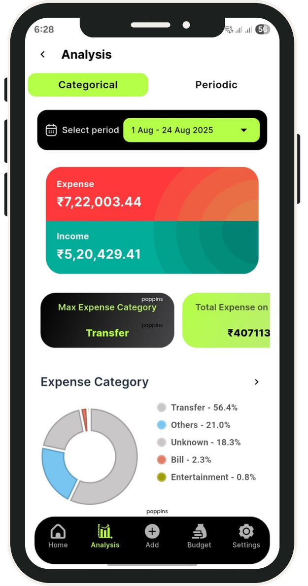 - ✔Smart categorization of transactions such as food, fuel, shopping, utilities, and more